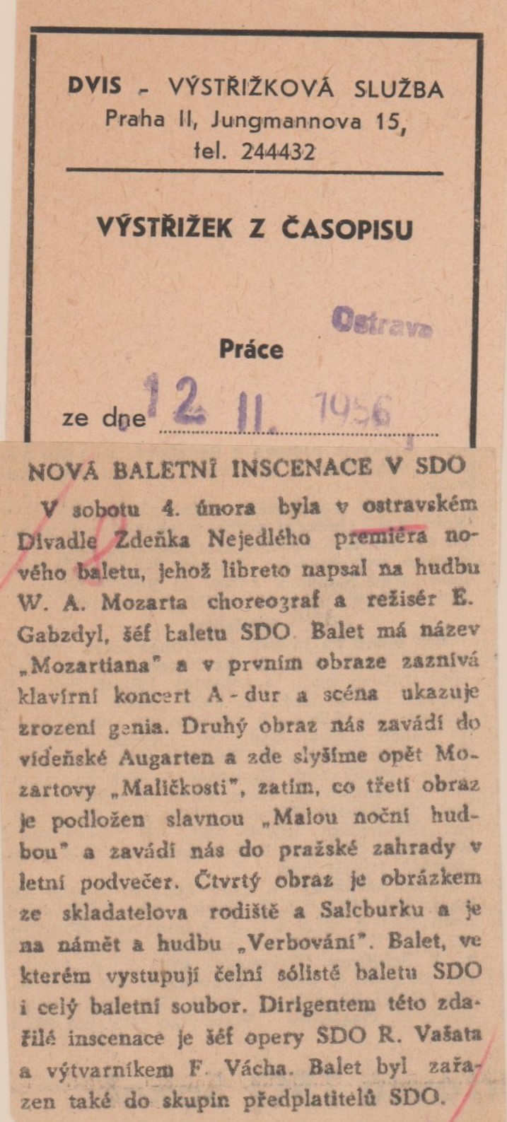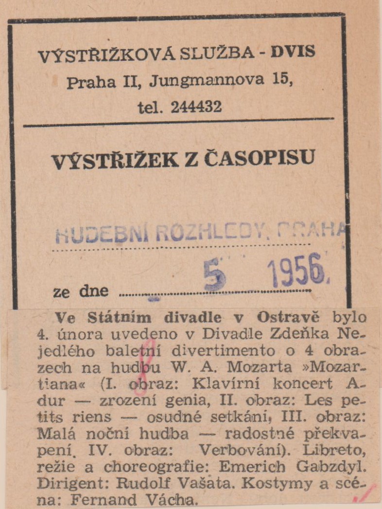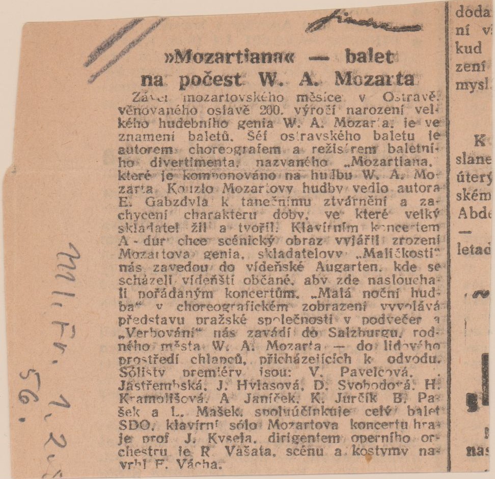 Představení 4. února 1956 hráno jako slavnostní k 200. výročí narozenin W. A. Mozarta.