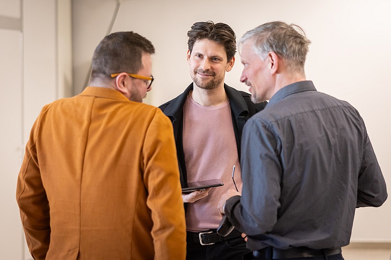 Herec činohry NDM Vít Roleček moderoval v pátek 21. března 2025 debatu se dvěma hosty – Michalem Zahálkou, který nově přeložil z francouzštiny hry Ptáčci a Pravda, a Michalem Kotroušem, překladatelem německé hry Soumrak nad krajinou.