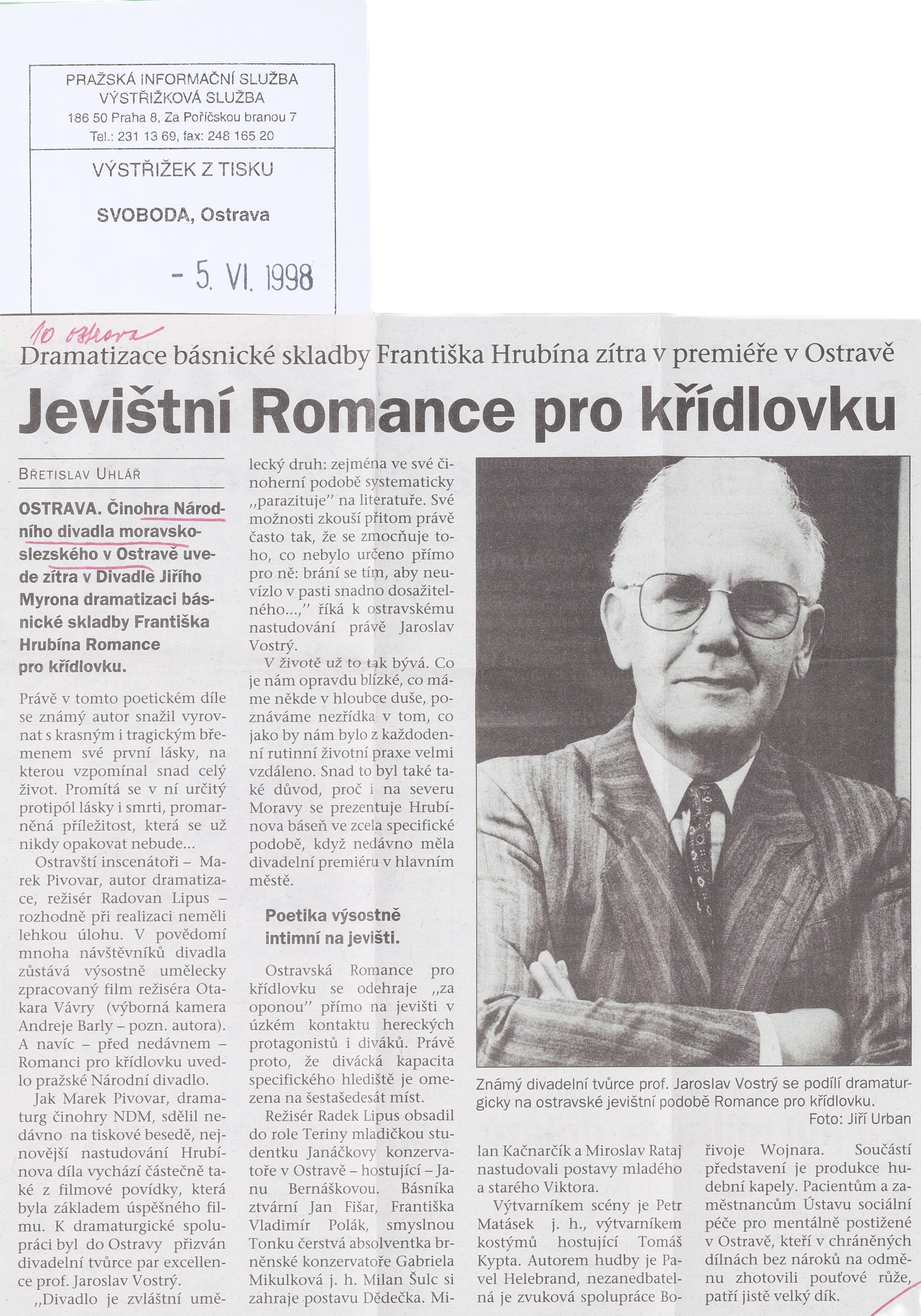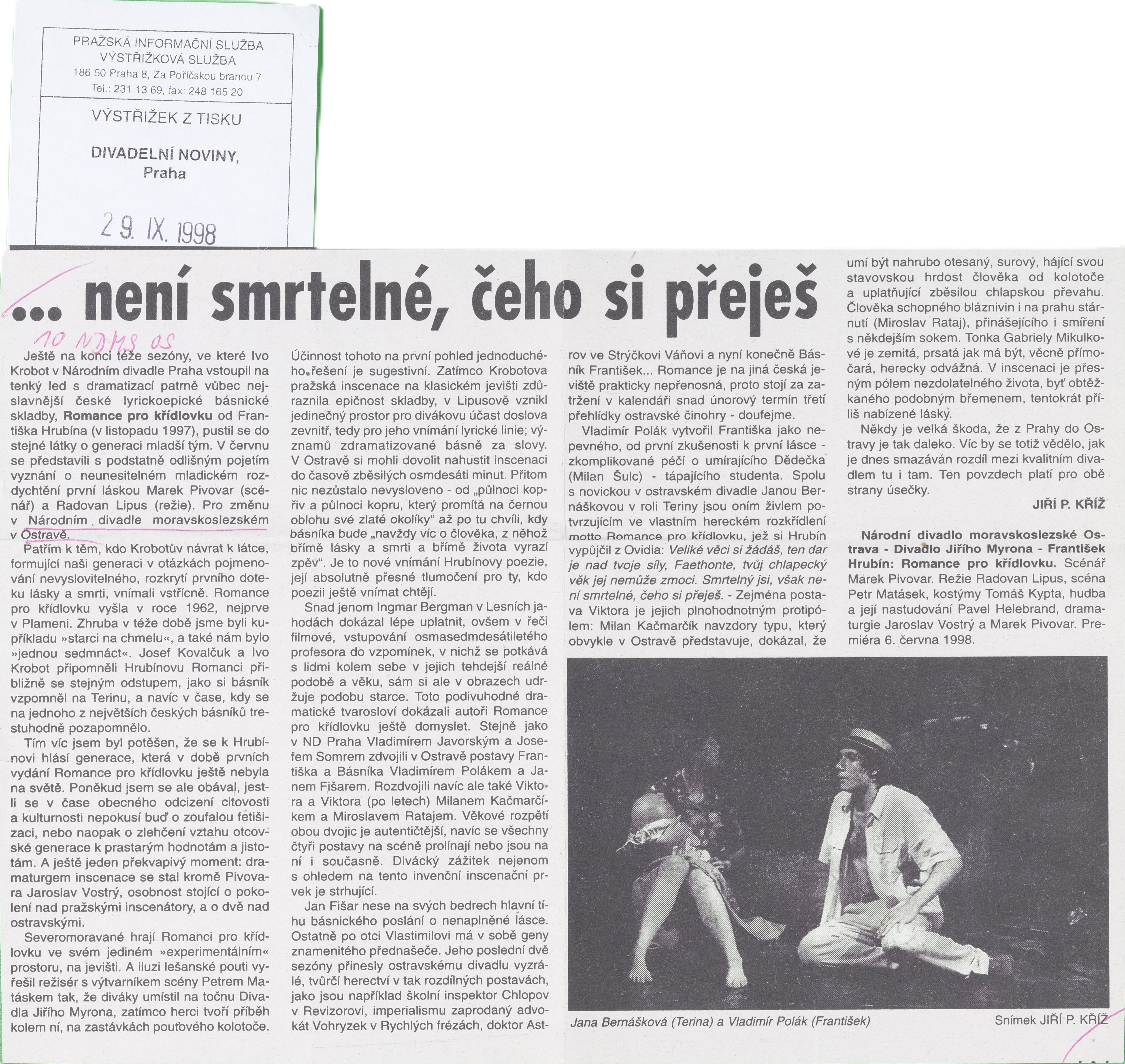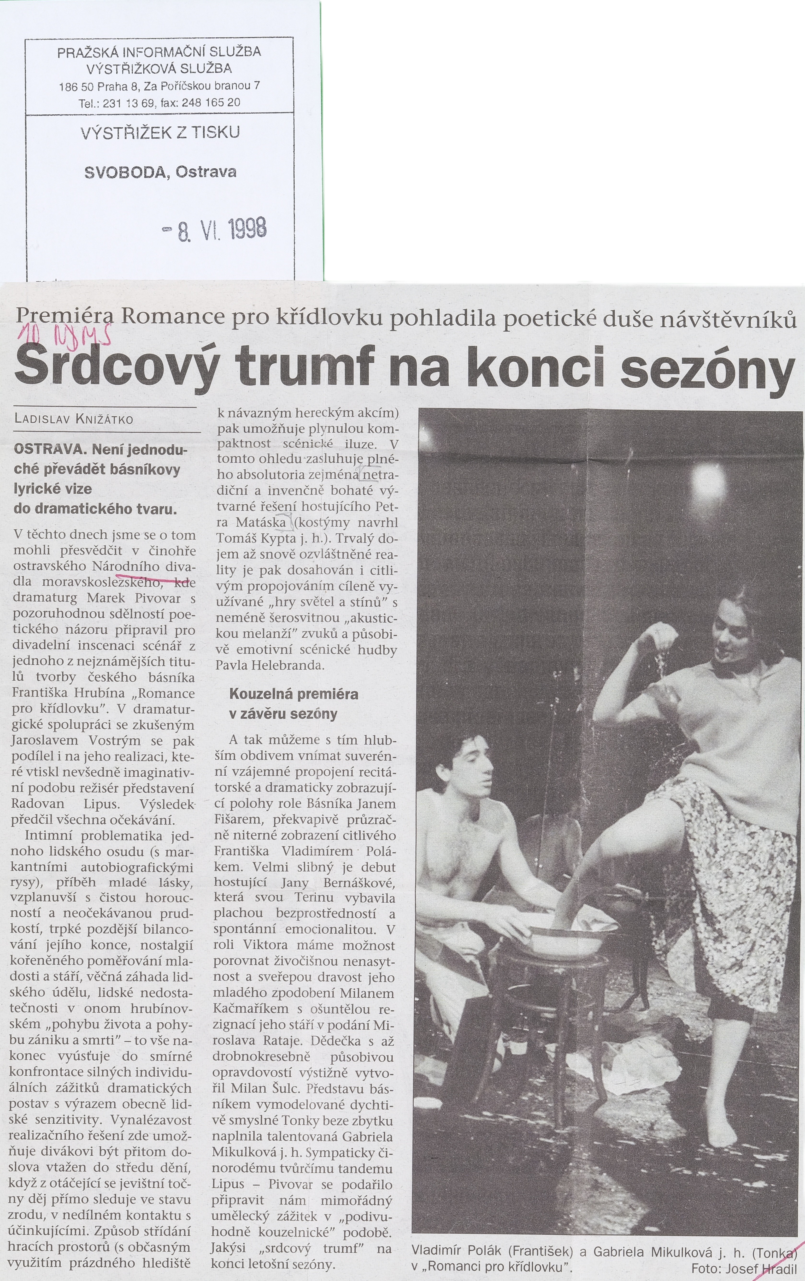 | 6.6.1998 | 19:00 | Divadlo Jiřího Myrona | Premiéra | zobrazit detail | |