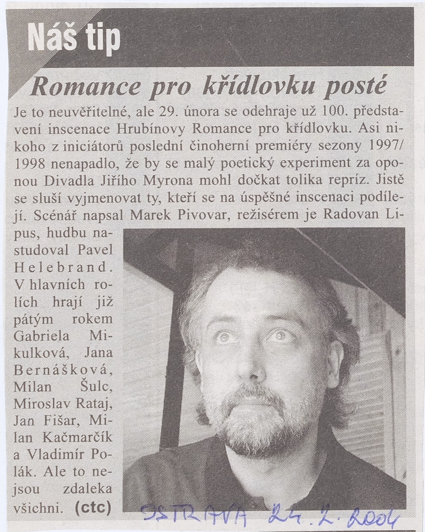| 29.2.2004 | 17:00 | Divadlo Jiřího Myrona | Repríza | zobrazit detail | |