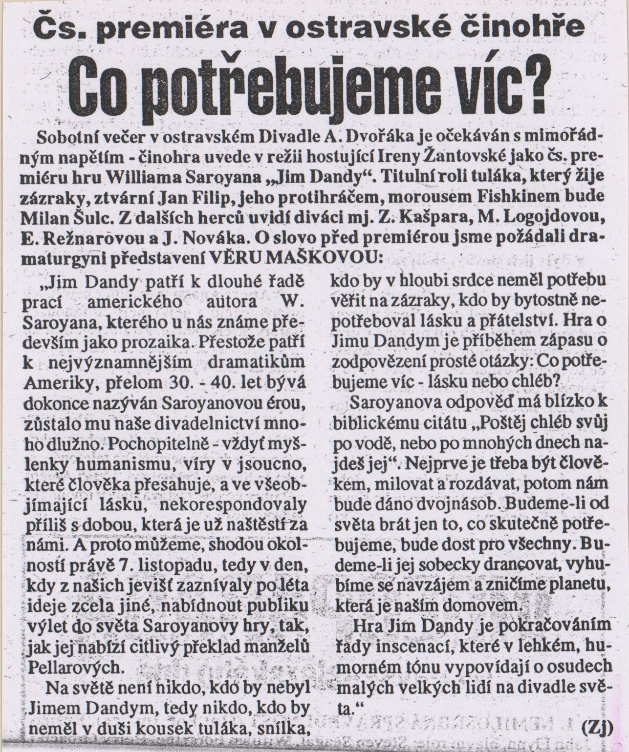 | 7.11.1992 | 19:00 | Divadlo Antonína Dvořáka | Premiéra | zobrazit detail | |