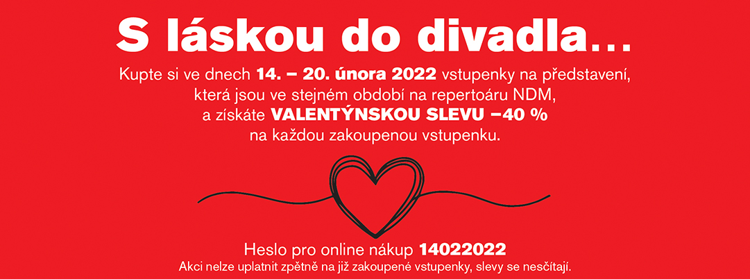 Vážení diváci, připravili jsme pro Vás speciální Valentýnskou slevu na vstupenky. Vyberte si z našeho bohatého repertoáru, těšíme se na Vaši návštěvu!