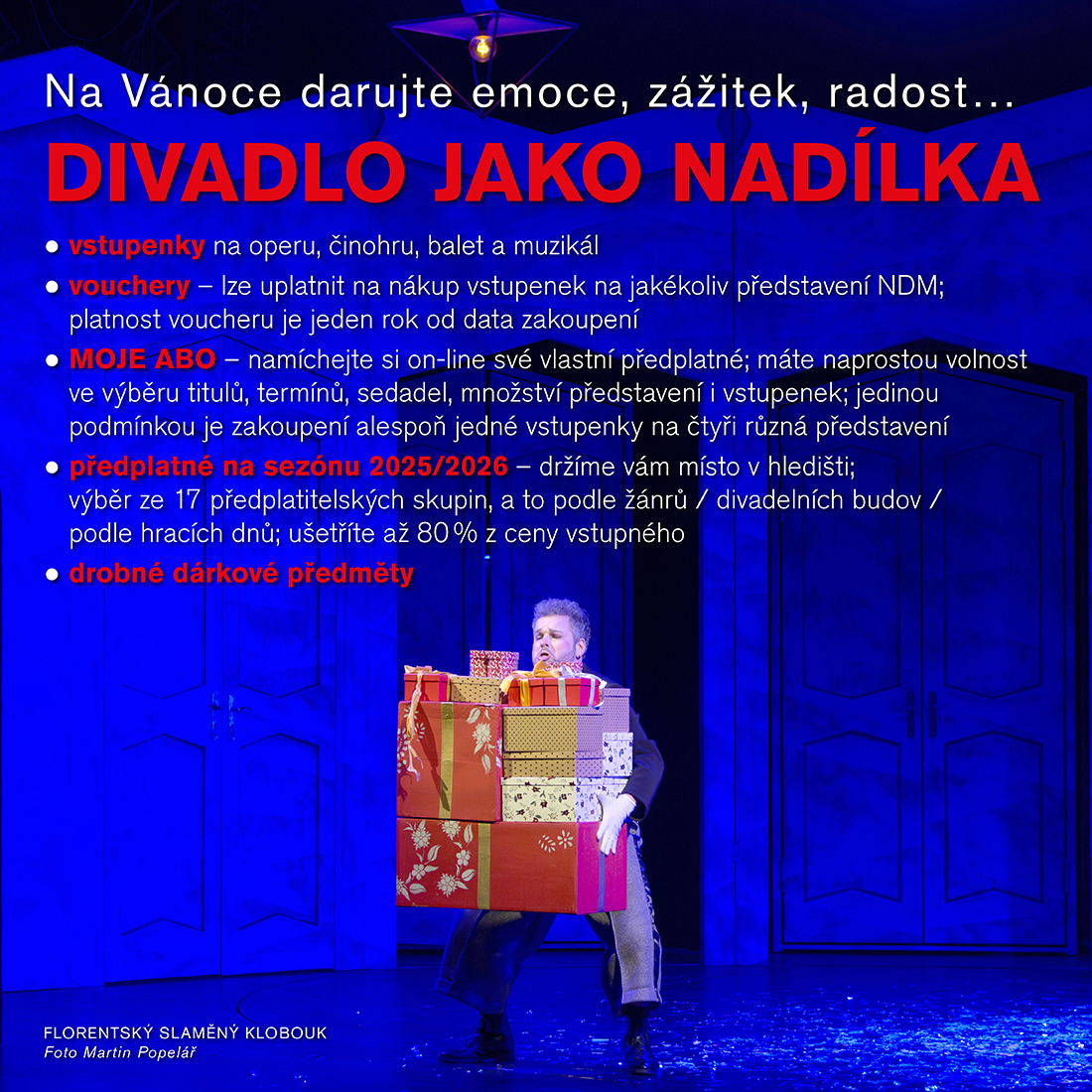 25.11.2025Nemáte ještě dárky na Vánoce? My je máme! Jdeme za vámi o adventu do ostravských obchodních center Avion Shopping Park (7. prosince) a Forum Nová Karolina (14. prosince) a jen tam a jen v tyto dny nakoupíte divadelní zážitky ještě výhodněji. Oba uvedené víkendy budeme mít také otevřeno v pokladně Divadla Jiřího Myrona.