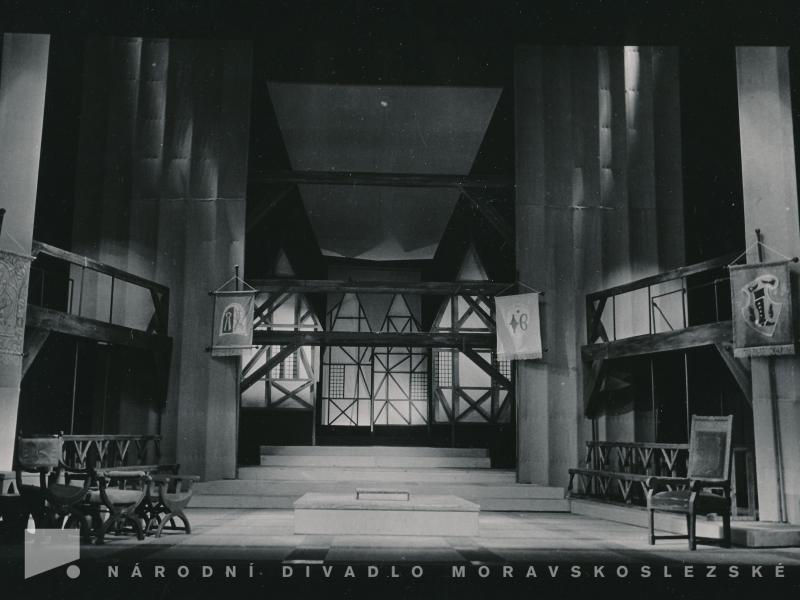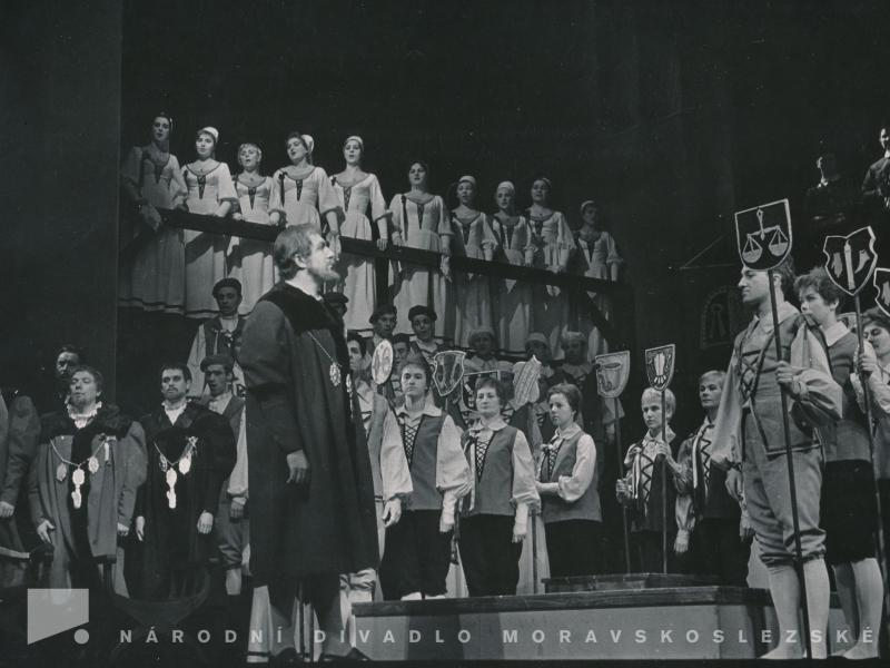 Jiří Procházka (Scéna), Bedřiška Ustohalová (Kostýmy), Jan Kyzlink (Hans Sachs, švec), Jiří Zahradníček (Walter Stolzing, mladý rytíř), Jitka Kovaříková (Eva, Pognerova dcera), Oldřich Lindauer (David, Sachsův učedník)