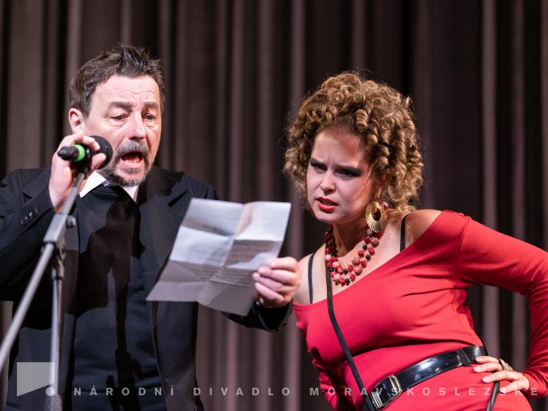 Tomáš Jirman (Petr Ivanovič Bobčinskij, statkář žjiící ve městě), Apolena Veldová (Marja Antonovna, jeho dcera)