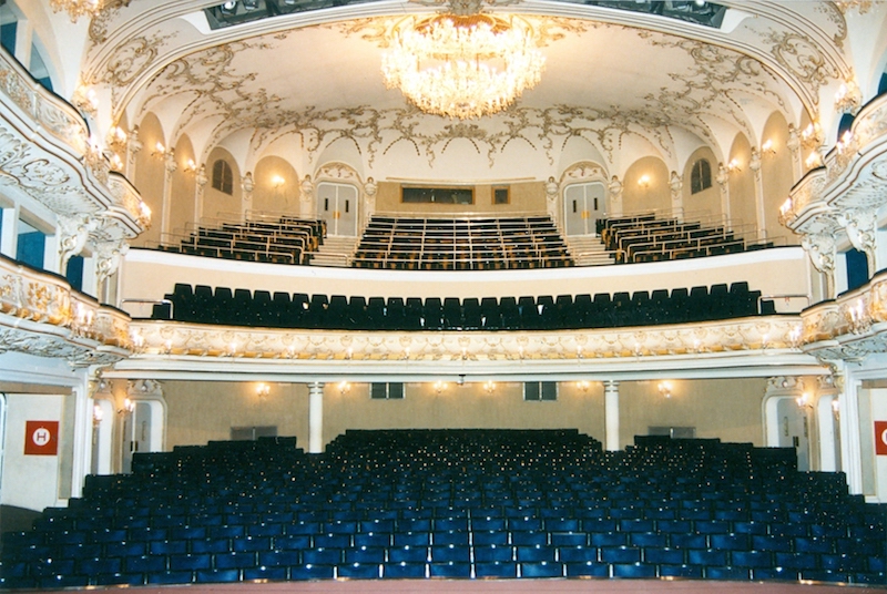 Původní modrý interiér. Během rekonstrukce získal zpět své prvotní barvy – červenou a zlatou