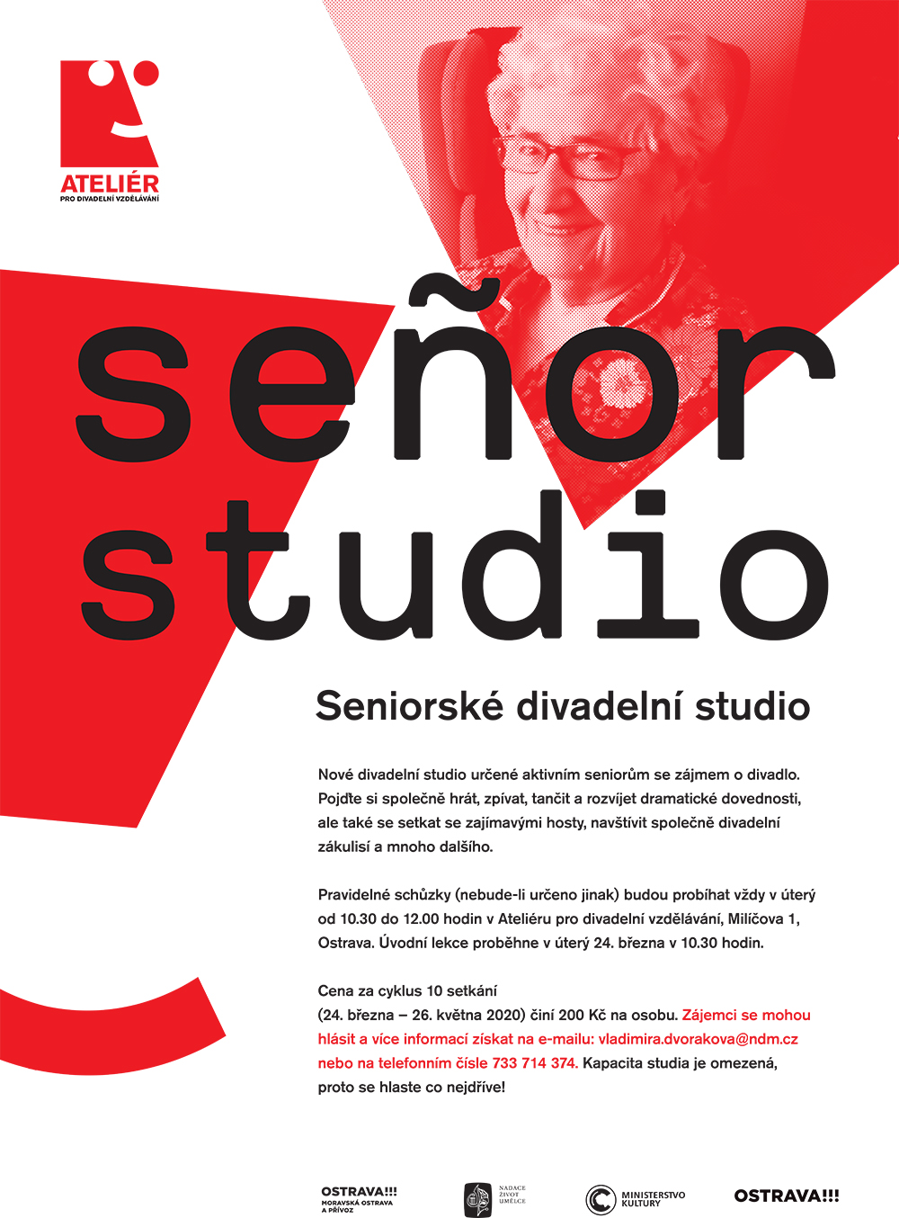 od 24. března 2020 v 10.30 hodin v Ateliéru Jarní ateliérovou novinkou je otevření nové skupiny divadelního studia určené výhradně aktivním seniorům se zájmem o umění s důrazem na divadlo. Budeme si společně zpívat, hrát a rozvíjet dramatické dovednosti, ale také se setkáme se zajímavými hosty, navštívíme společně divadelní zákulisí a mnoho dalšího. Pravidelné schůzky (nebude-li určeno jinak) budou probíhat vždy v úterý od 10.30 do 12.00 hodin v Ateliéru.