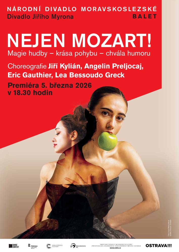 An evening celebrating the birth of W. A. Mozart Choreographers Jiří Kylián, Angelin Preljocaj, Eric Gauthier, Lea Bessoudo Greck More Than Mozart! is more than a tribute to dance as an art form — it’s a deep dive into human emotion. There are two contrasting yet connected works by Jiří Kylián at the heart of the evening: Sechs Tänze and Petite Mort. Both are set to the brilliant music of Wolfgang Amadeus Mozart, and together they reveal two faces of the human experience. With wit, irony, and a touch of absurdity, Sechs Tänze pokes fun at social norms and pretences. In contrast, Petite Mort is a lyrical, almost mythic celebration of physicality, love, and passion. The evening also features Ballet 102, a playful and inventive duet by Eric Gauthier—former soloist of Stuttgart Ballet and now an acclaimed choreographer—exploring the endless possibilities of ballet positions with humour and flair. Rounding out the program is a new piece by French-born Israeli choreographer and audiovisual artist Lea Bessoudo Greck, who previously collaborated with our company on the acclaimed work Šárka in danENJOY. More than Mozart! promises an evening of contrasts, emotion, and lighthearted charm. Premiere on 5 March 2026 at the Jiří Myron Theatre |